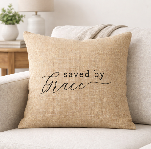 Bring faith and comfort into your home with our Saved By Grace linen throw pillow. Designed with a soft neutral tone and bold cross-centered typography, this pillow adds meaningful style to sofas, chairs, beds, and reading nooks.