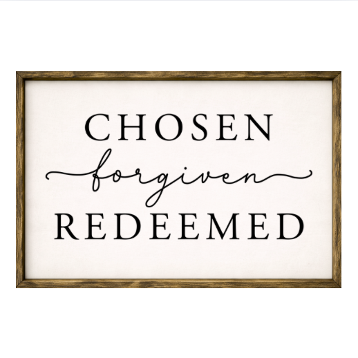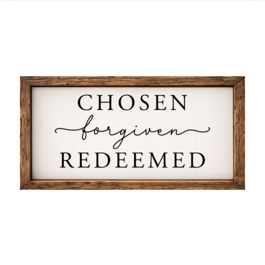 Our Chosen Forgiven Redeemed sign features elegant white lettering on a dark background framed in a handcrafted rustic wood box frame. The classic contrast of modern script with distressed wood makes this piece versatile for farmhouse, modern, or traditional décor styles. Each sign is built as a finished wood box, giving it depth, durability, and a high-end boutique feel. Designed to be displayed effortlessly—hang it directly from the frame or let it stand freely on a shelf, mantel, or table.