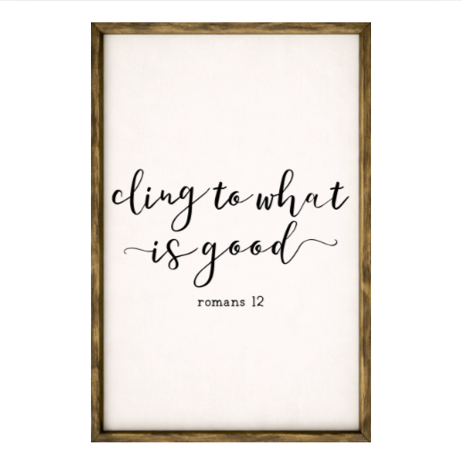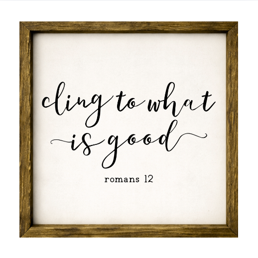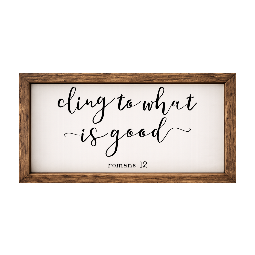Our Cling to What is Good sign features elegant white lettering on a dark background framed in a handcrafted rustic wood box frame. The classic contrast of modern script with distressed wood makes this piece versatile for farmhouse, modern, or traditional décor styles. Each sign is built as a finished wood box, giving it depth, durability, and a high-end boutique feel. Designed to be displayed effortlessly—hang it directly from the frame or let it stand freely on a shelf, mantel, or table.