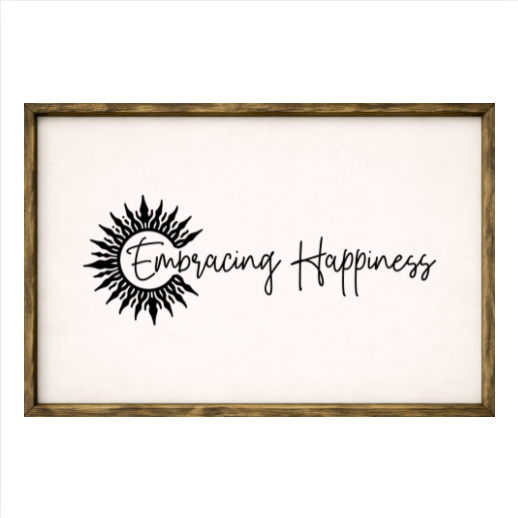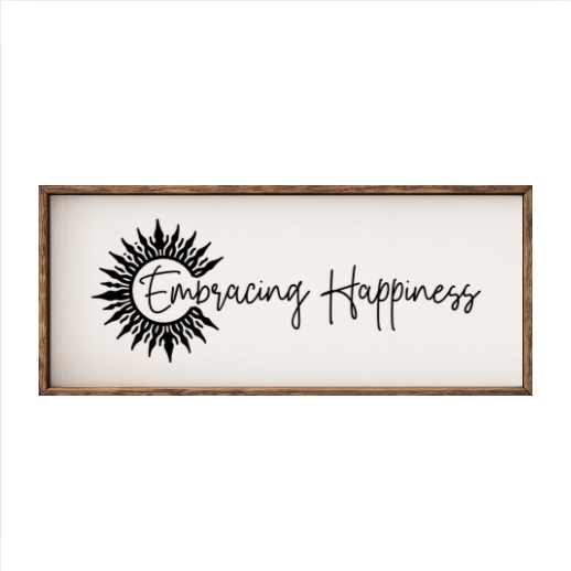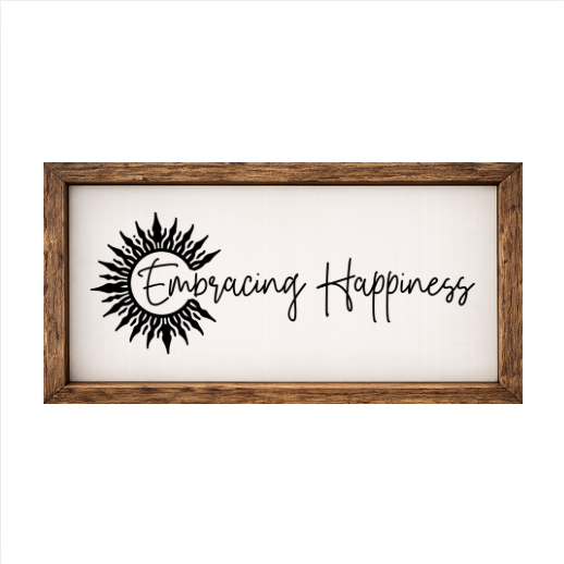 Our Embracing Happiness sign features elegant white lettering on a dark background framed in a handcrafted rustic wood box frame. The classic contrast of modern script with distressed wood makes this piece versatile for farmhouse, modern, or traditional décor styles. Each sign is built as a finished wood box, giving it depth, durability, and a high-end boutique feel. Designed to be displayed effortlessly—hang it directly from the frame or let it stand freely on a shelf, mantel, or table.