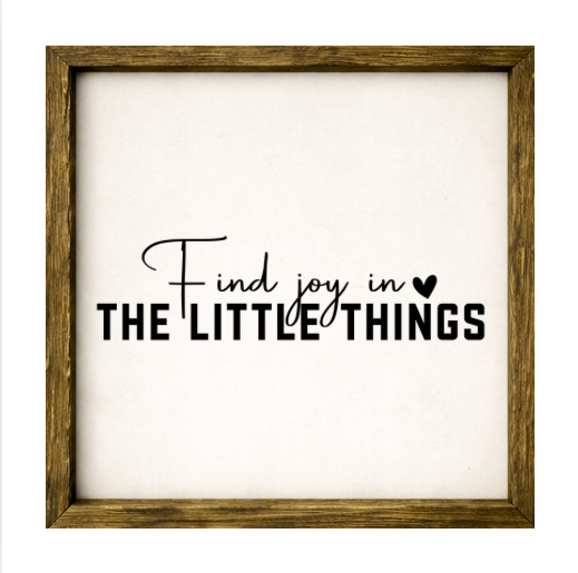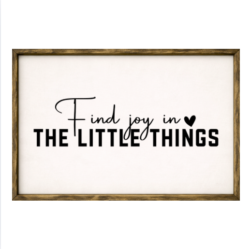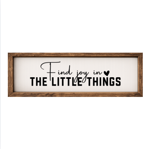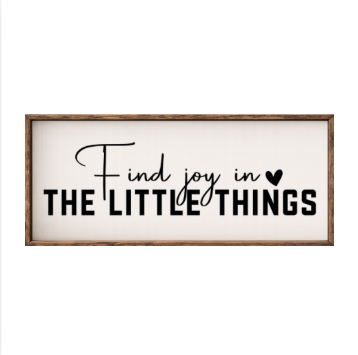 Our Find Joy in the Little Things sign features elegant white lettering on a dark background framed in a handcrafted rustic wood box frame. The classic contrast of modern script with distressed wood makes this piece versatile for farmhouse, modern, or traditional décor styles. Each sign is built as a finished wood box, giving it depth, durability, and a high-end boutique feel. Designed to be displayed effortlessly—hang it directly from the frame or let it stand freely on a shelf, mantel, or table.