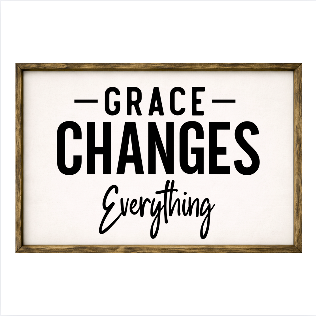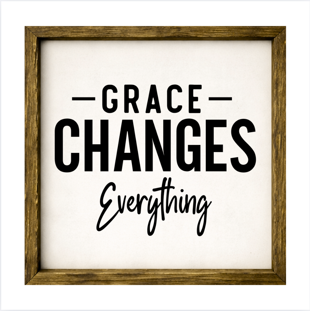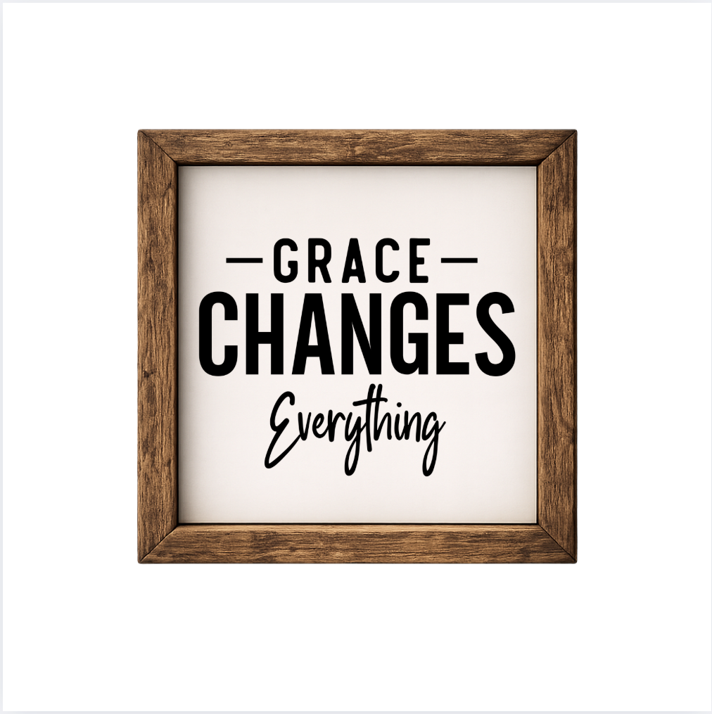 Our Grace Changes Everything sign features elegant white lettering on a dark background framed in a handcrafted rustic wood box frame. The classic contrast of modern script with distressed wood makes this piece versatile for farmhouse, modern, or traditional décor styles. Each sign is built as a finished wood box, giving it depth, durability, and a high-end boutique feel. Designed to be displayed effortlessly—hang it directly from the frame or let it stand freely on a shelf, mantel, or table.