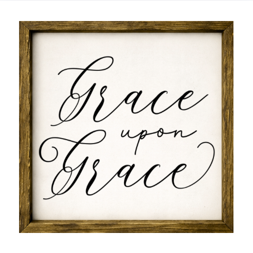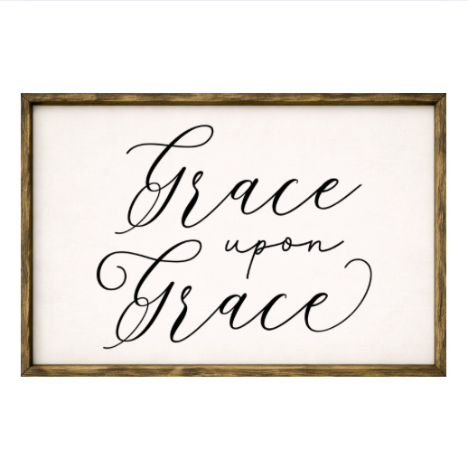 Our Grace Upon Grace sign features elegant white lettering on a dark background framed in a handcrafted rustic wood box frame. The classic contrast of modern script with distressed wood makes this piece versatile for farmhouse, modern, or traditional décor styles. Each sign is built as a finished wood box, giving it depth, durability, and a high-end boutique feel. Designed to be displayed effortlessly—hang it directly from the frame or let it stand freely on a shelf, mantel, or table.