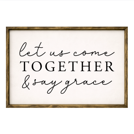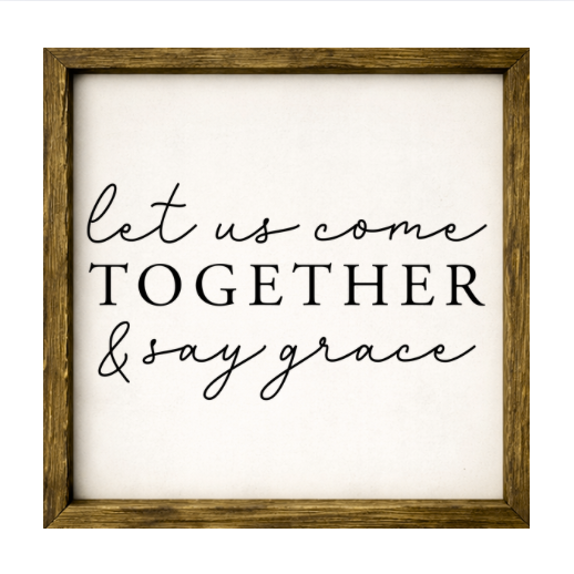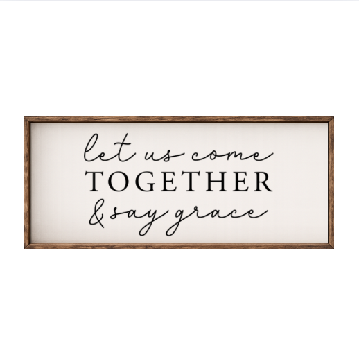 Our Let Us Come Together and Say Grace sign features elegant white lettering on a dark background framed in a handcrafted rustic wood box frame. The classic contrast of modern script with distressed wood makes this piece versatile for farmhouse, modern, or traditional décor styles. Each sign is built as a finished wood box, giving it depth, durability, and a high-end boutique feel. Designed to be displayed effortlessly—hang it directly from the frame or let it stand freely on a shelf, mantel, or table.