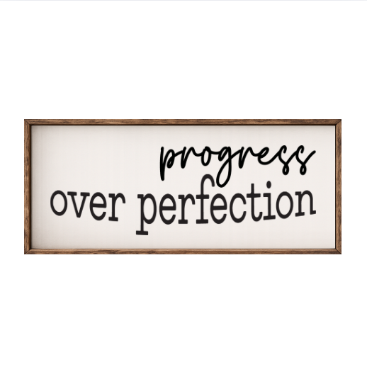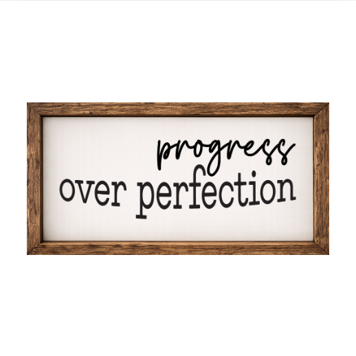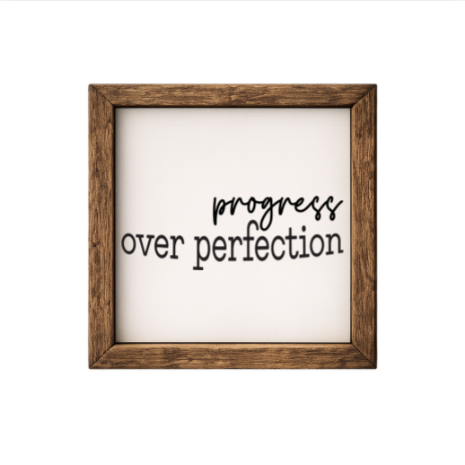 Our Progress Over Perfection sign features elegant white lettering on a dark background framed in a handcrafted rustic wood box frame. The classic contrast of modern script with distressed wood makes this piece versatile for farmhouse, modern, or traditional décor styles. Each sign is built as a finished wood box, giving it depth, durability, and a high-end boutique feel. Designed to be displayed effortlessly—hang it directly from the frame or let it stand freely on a shelf, mantel, or table.