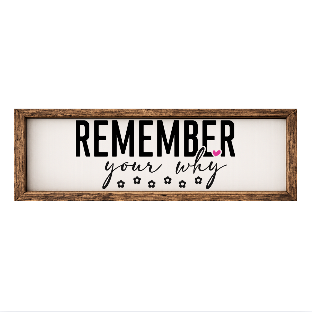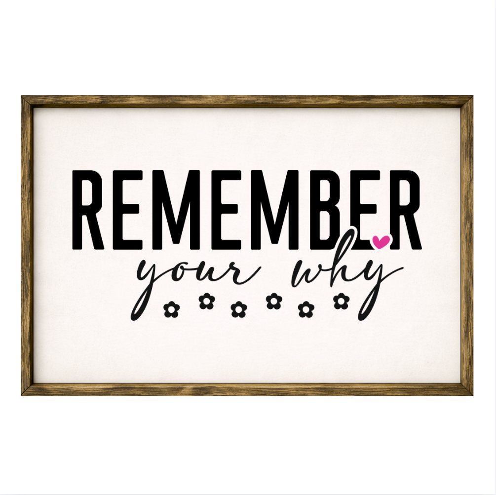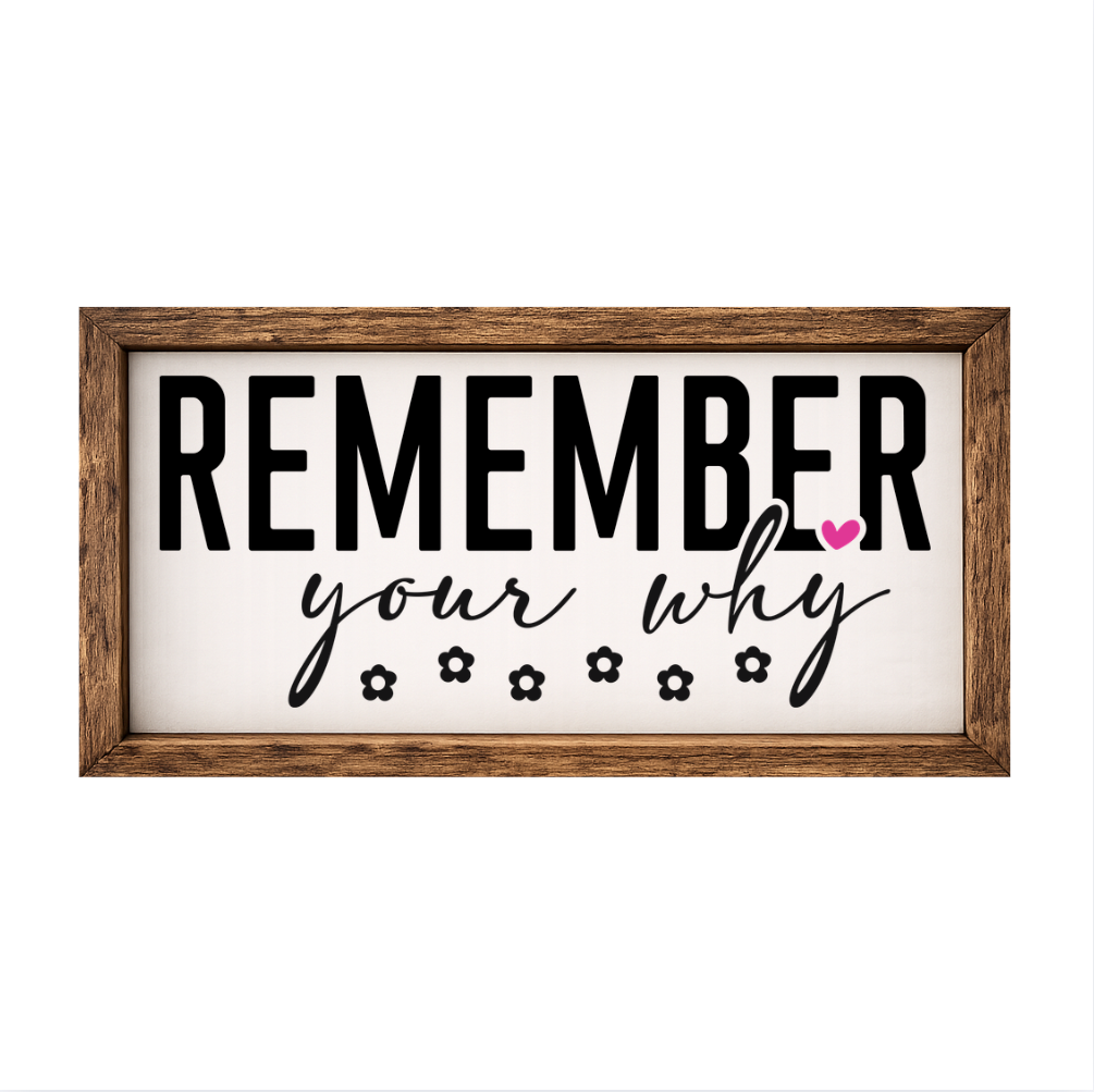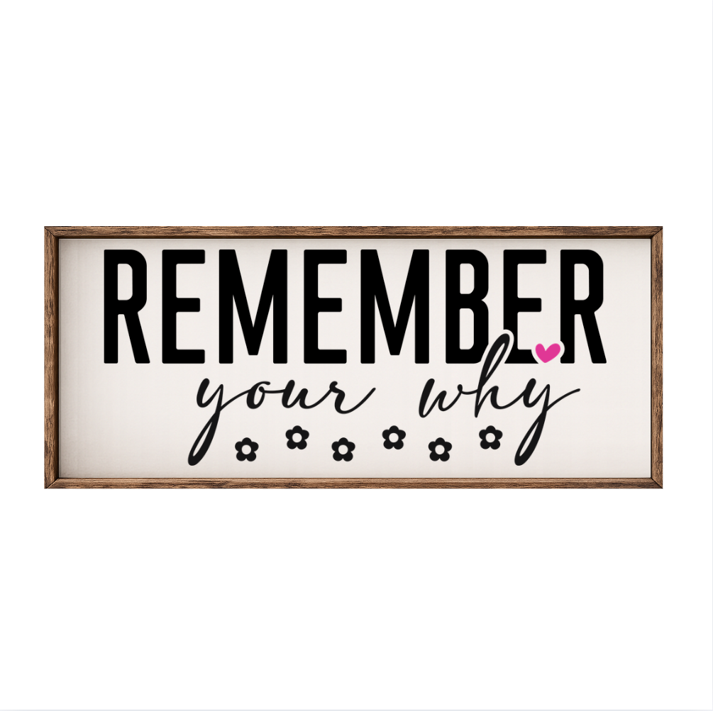 Our Remember Your Why sign features elegant white lettering on a dark background framed in a handcrafted rustic wood box frame. The classic contrast of modern script with distressed wood makes this piece versatile for farmhouse, modern, or traditional décor styles. Each sign is built as a finished wood box, giving it depth, durability, and a high-end boutique feel. Designed to be displayed effortlessly—hang it directly from the frame or let it stand freely on a shelf, mantel, or table.