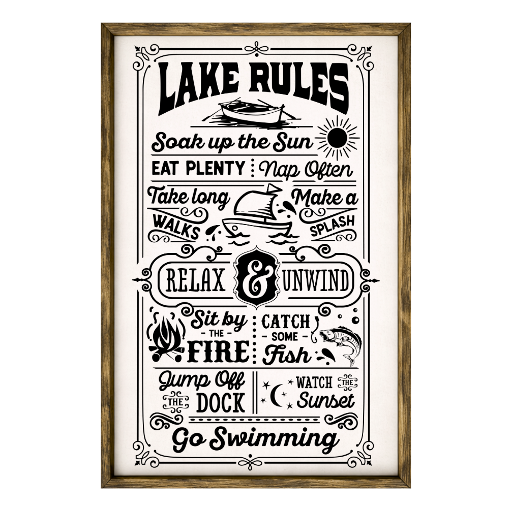 Our Lake Rules sign captures the easygoing spirit of lake life, featuring clean, easy-to-read lettering on a dark background framed in a handcrafted rustic wood box frame. The carefree list — “Soak Up the Sun, Eat Plenty, Nap Often, Take Long Walks, Make a Splash, Relax & Unwind, Sit by the Fire, Catch Some Fish, Jump Off the Dock, Watch the Sunset, Go Swimming” — makes this a perfect accent for lake houses, cabins, docks, or outdoor living spaces. Each sign is built as a finished wood box for added depth, durability, and a boutique feel. Designed for effortless display — hang it directly from the frame or let it stand freely on a shelf, mantel, or lakeside table.