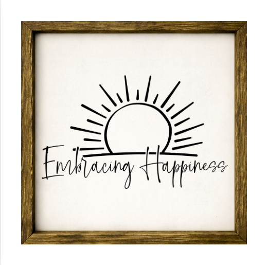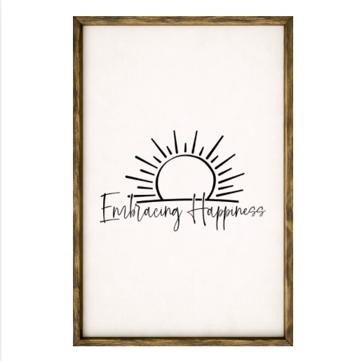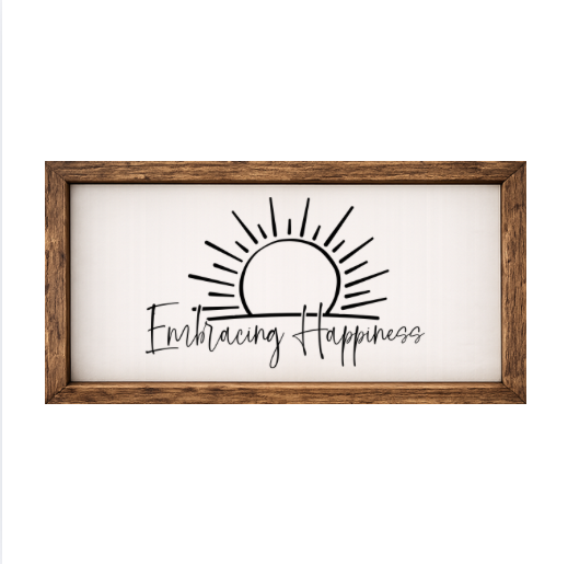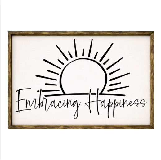 Our Embracing Happiness sign features elegant white lettering on a dark background framed in a handcrafted rustic wood box frame. The classic contrast of modern script with distressed wood makes this piece versatile for farmhouse, modern, or traditional décor styles. Each sign is built as a finished wood box, giving it depth, durability, and a high-end boutique feel. Designed to be displayed effortlessly—hang it directly from the frame or let it stand freely on a shelf, mantel, or table.
