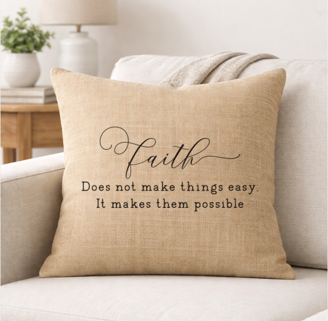 Bring faith and comfort into your home with our Faith Does Not Make Things Easy linen throw pillow. Designed with a soft neutral tone and bold cross-centered typography, this pillow adds meaningful style to sofas, chairs, beds, and reading nooks.