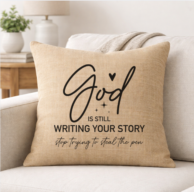 Bring faith and comfort into your home with our God is Still Writing Your Story linen throw pillow. Designed with a soft neutral tone and bold cross-centered typography, this pillow adds meaningful style to sofas, chairs, beds, and reading nooks.
