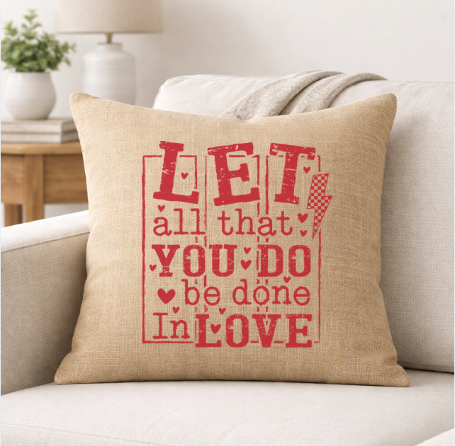Bring faith and comfort into your home with our Let All That You Do Be Done In Love linen throw pillow. Designed with a soft neutral tone and bold cross-centered typography, this pillow adds meaningful style to sofas, chairs, beds, and reading nooks.