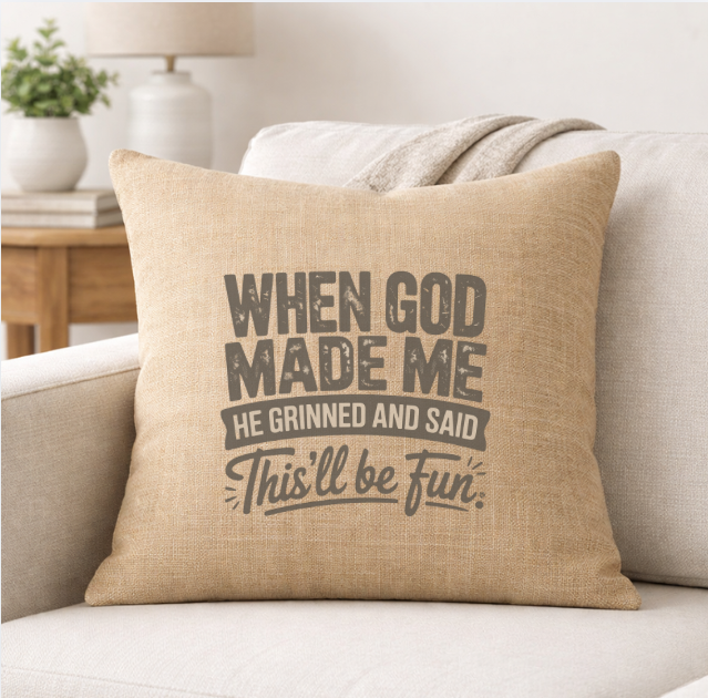 Bring faith and comfort into your home with our When God Made Me linen throw pillow. Designed with a soft neutral tone and bold cross-centered typography, this pillow adds meaningful style to sofas, chairs, beds, and reading nooks.